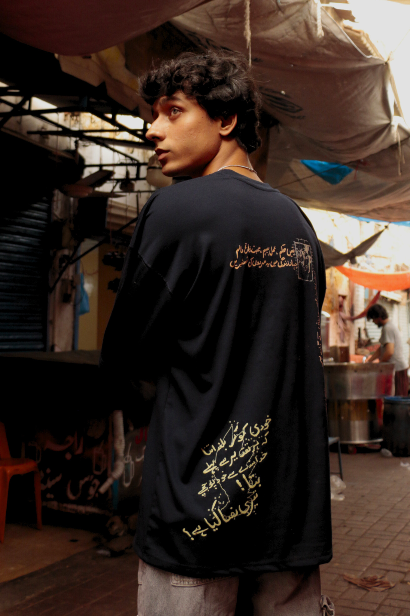 Saddar ; the beating heart of Karachi’s trade and chaos, sits at the center of this design, framed by Ghalib’s haunting verse: “Maut ka ek din muayyan hai, neend raat bhar kyūn nahī aati.” Beneath it, Manto’s truth echoes: “What had to happen, did, and what will happen, will.”